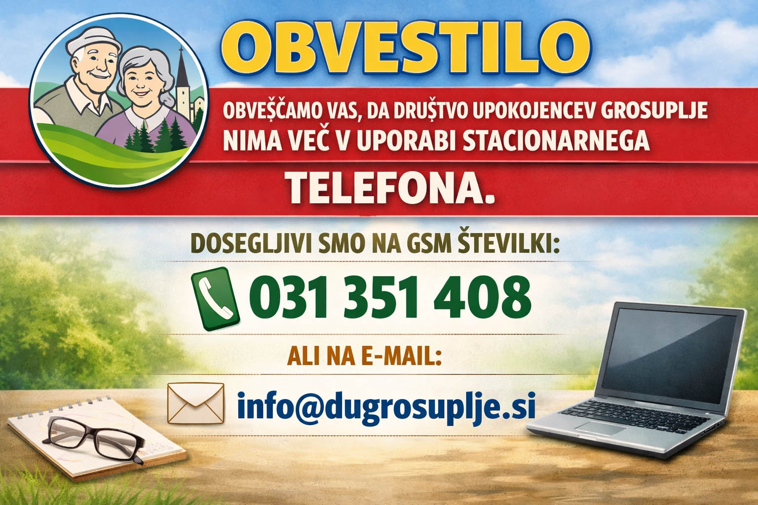 OBVEŠČAMO VAS, DA DRUŠTVO UPOKOJENCEV GROSUPLJE